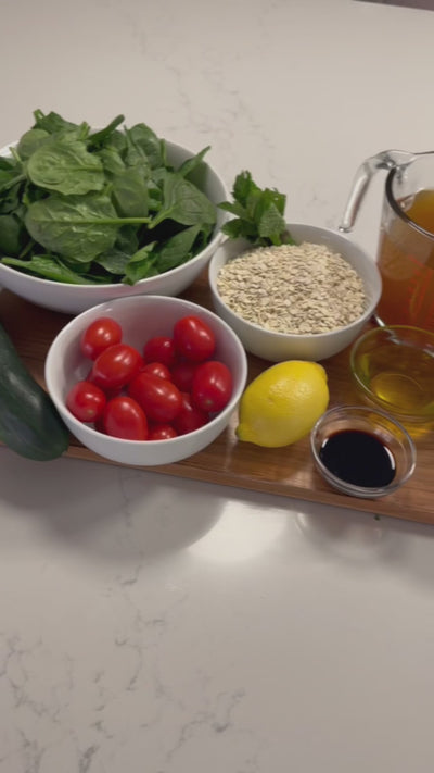 3. Add spinach, tomatoes, cucumbers, pomegranate seeds, herbs, lemon juice, and feta to the now chilled pearled barley.